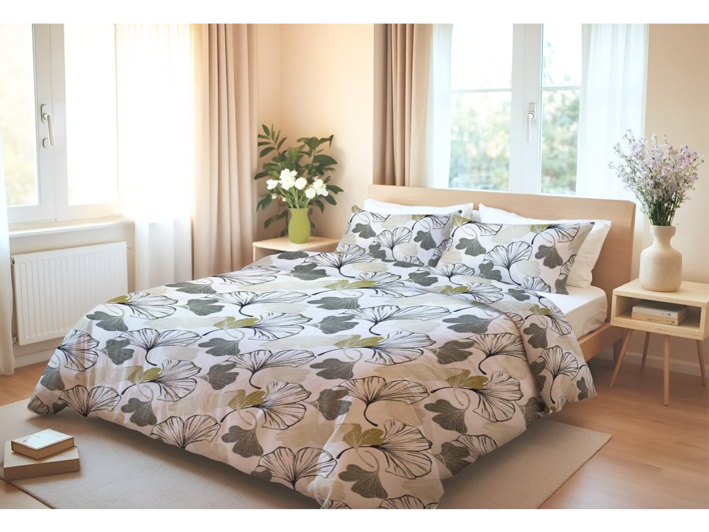 Vneste do svojej spálne harmóniu prírody s posteľnými obliečkami BELUŠA. Elegantná potlač ginko listov v jemných sivo-zelených odtieňoch pôsobí upokojujúco a dodá interiéru svieži, prirodzený vzhľad.