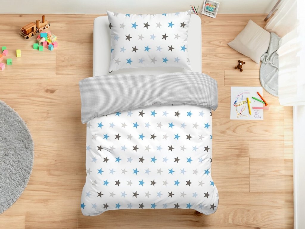 Kúzelné obliečky s farebnými hviezdičkami v kombinácii modrej, bielej a sivej farby premenia detskú izbu na čarovné miesto. Na vrchnej strane nájdete potlač jemných farebných hviezdičiek, zatiaľ čo spodná strana je ladená do elegantného sivého kára. Tento hravý a zároveň nežný dizajn si vaša ratolesť okamžite zamiluje a postará sa o jej pokojný spánok.