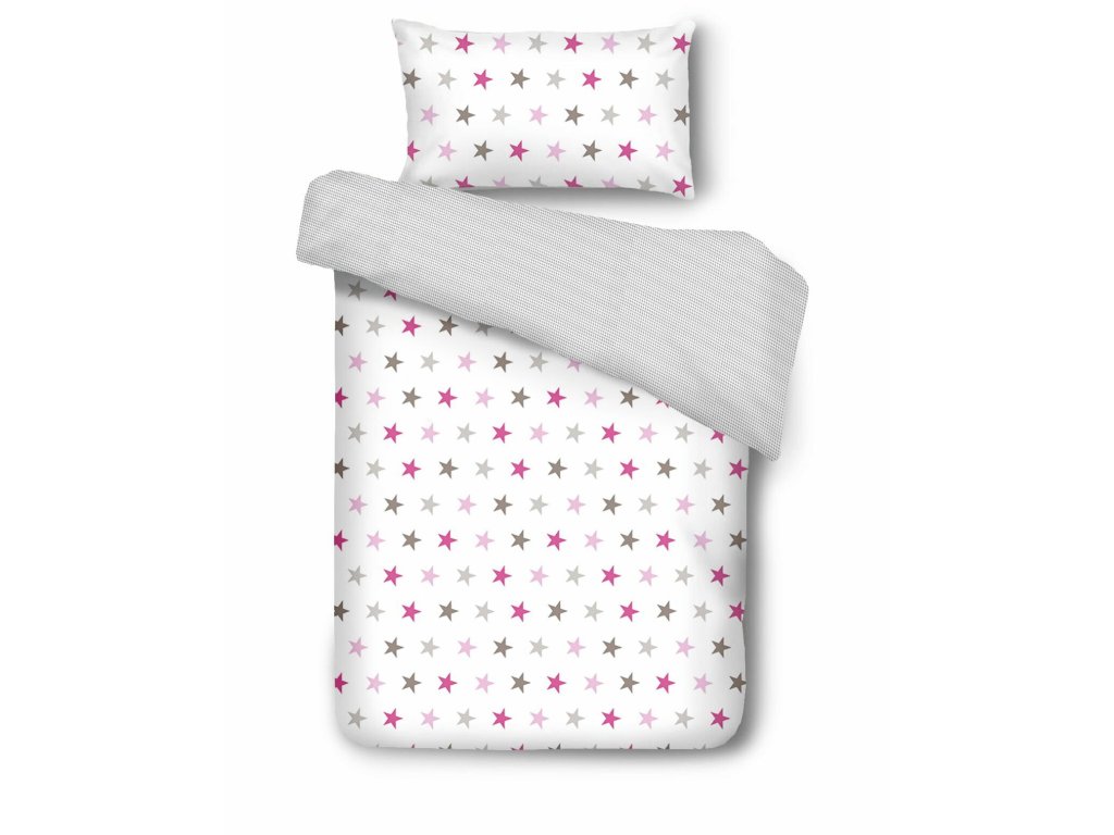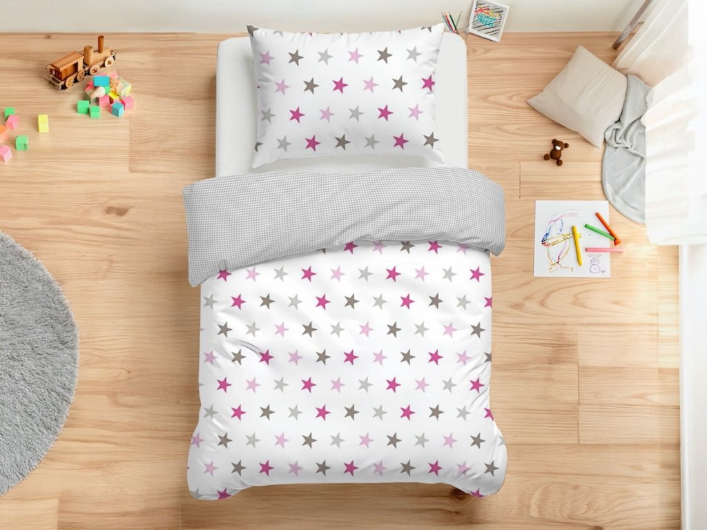 Kúzelné obliečky s farebnými hviezdičkami v kombinácii ružovej, bielej a sivej farby premenia detskú izbu na čarovné miesto. Na vrchnej strane nájdete potlač jemných farebných hviezdičiek, zatiaľ čo spodná strana je ladená do elegantného sivého kára. Tento hravý a zároveň nežný dizajn si vaša ratolesť okamžite zamiluje a postará sa o jej pokojný spánok.