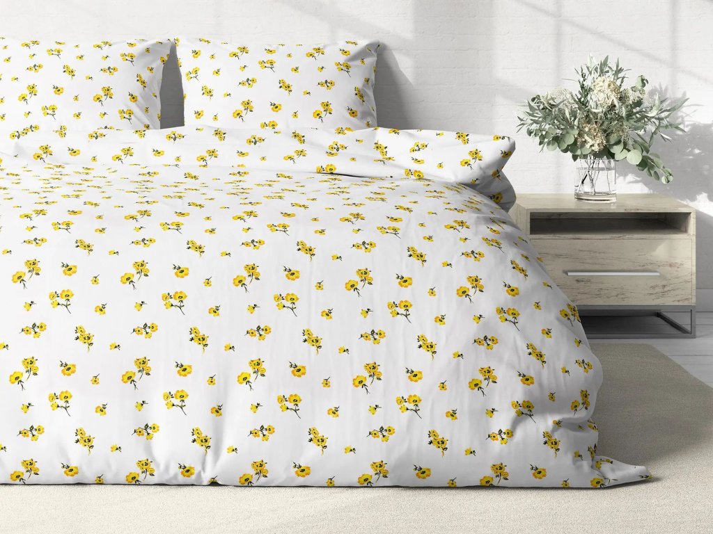 Vneste do svojej spálne sviežu a romantickú atmosféru s bavlnenými obliečkami SLNEČNÉ KVETY. Jemný motív drobných žltých kvietkov na bielom podklade pôsobí klasicky, no elegantne a rozžiari každý interiér.