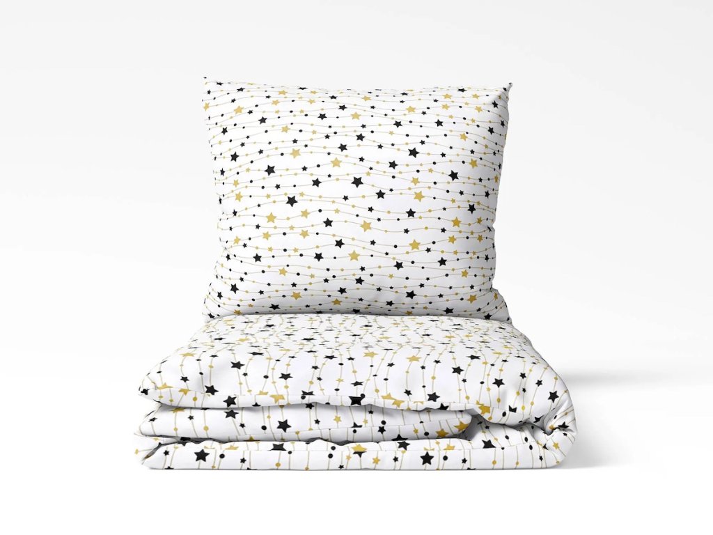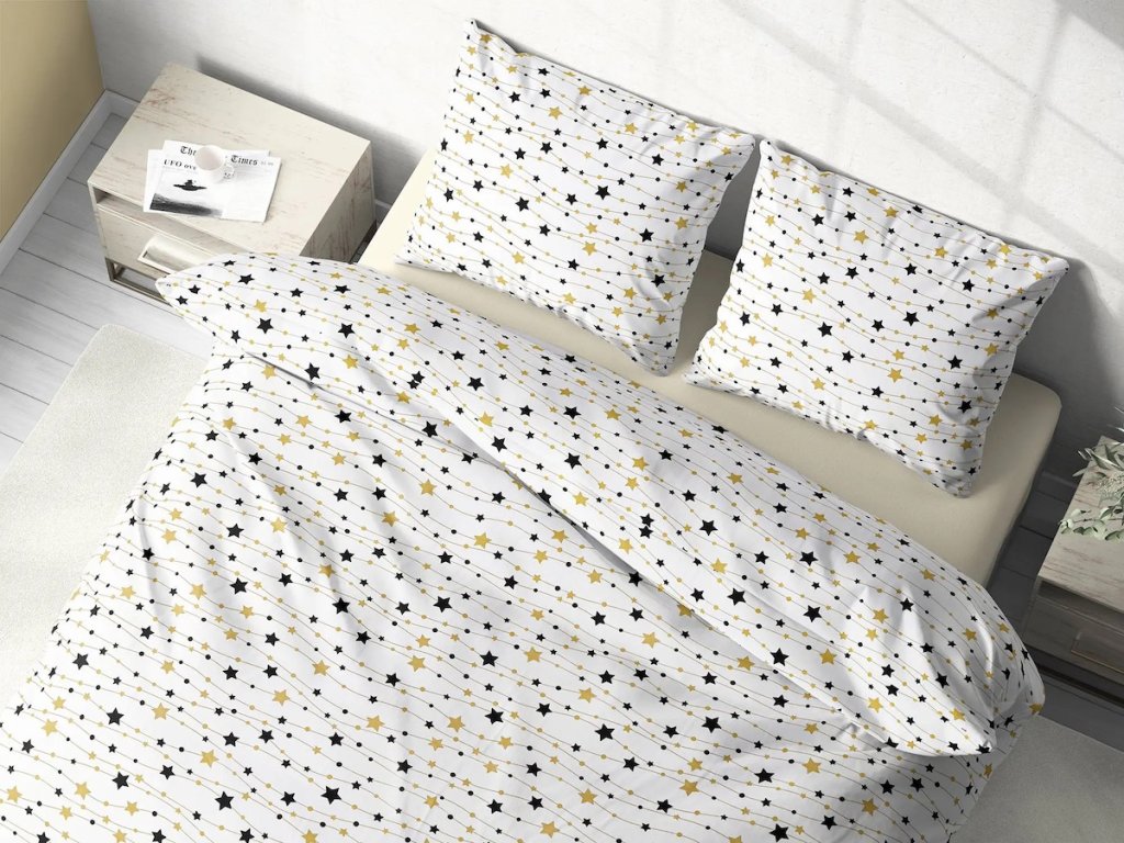 Vneste do svojej spálne pravú zimnú atmosféru s našimi flanelovými obliečkami s vianočnou potlačou hviezdičiek. Kombinácia zlatej a čiernej farby vytvára luxusný a nadčasový vzhľad, ktorý premení vašu spálňu na miesto plné pohody, tepla a sviatočnej nálady.