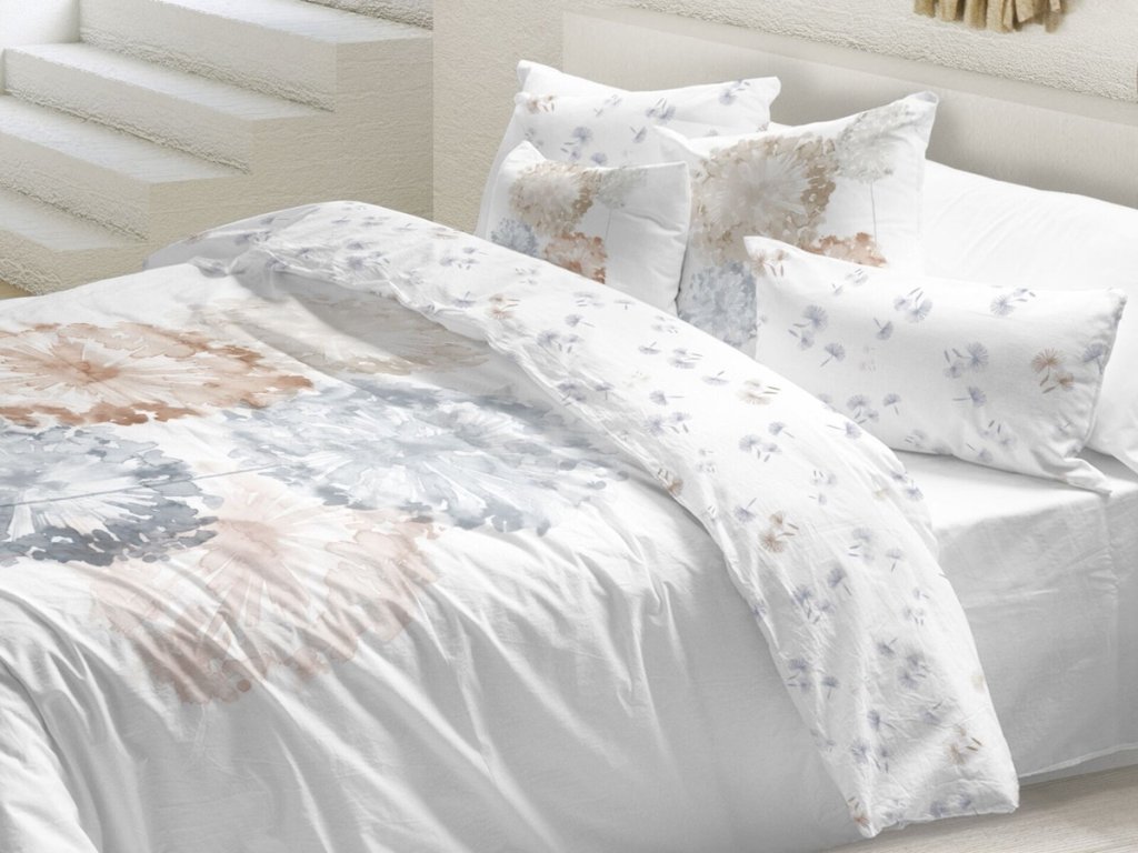 Zabaľte sa do luxusu s makosaténovými obliečkami Brume, ktoré spájajú krásu prírody a dokonalý komfort. Prednú stranu zdobí kvetinový motív púpav v prírodných odtieňoch, zadná strana je pokrytá menším vzorom púpavových padáčikov.