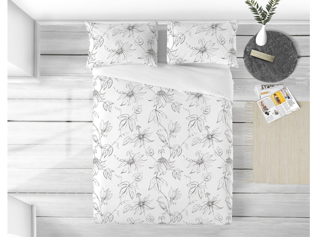 Zabaľte sa do luxusu s makosaténovými obliečkami Claire, ktoré spájajú krásu prírody a dokonalý komfort. Prednú stranu zdobí elegantný rastlinný motív v odtieňoch sivej na bielom podklade, zadná strana je čistá, snehovo biela.