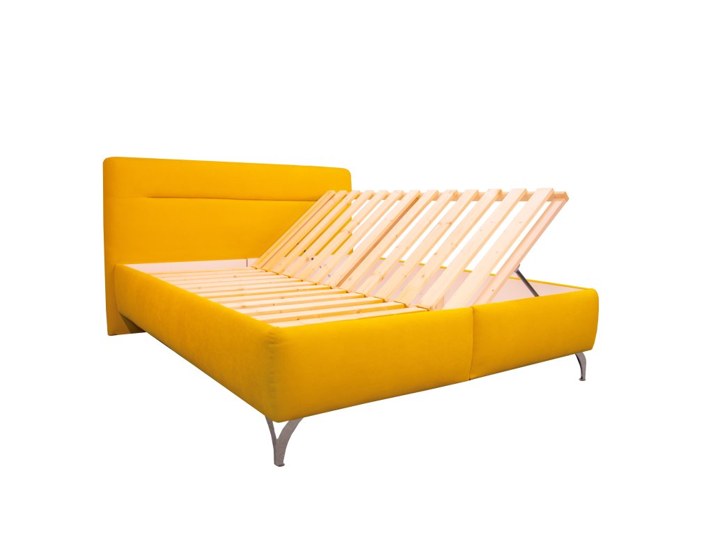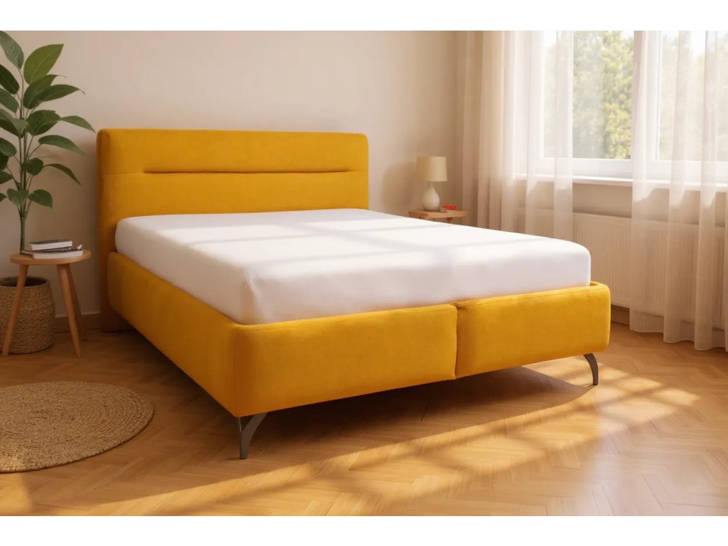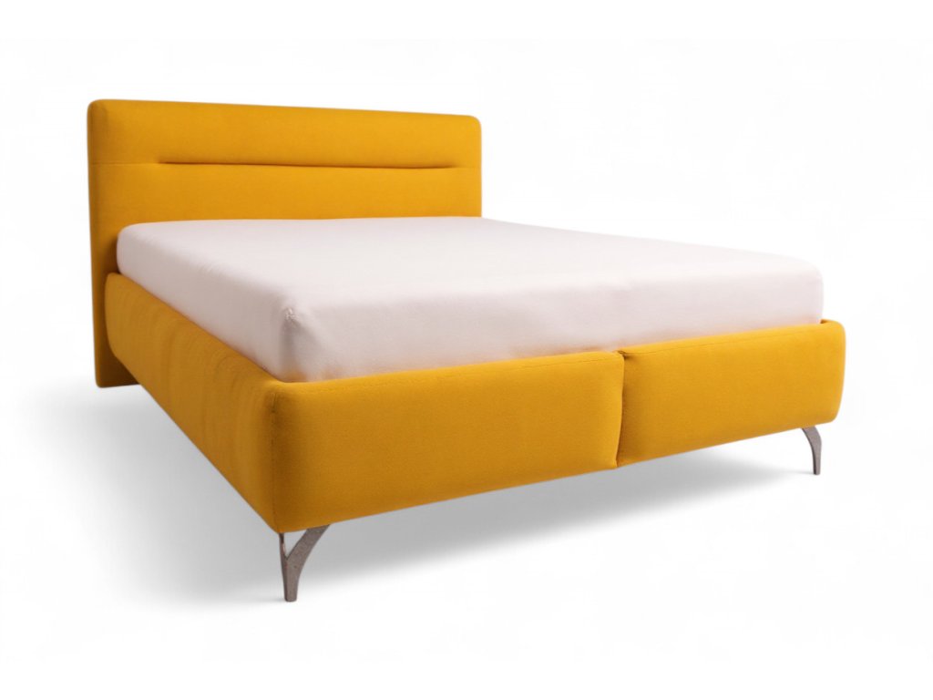 - Posteľ stojí na 15 cm vysokých kovových nožičkách, ktoré jej dodávajú ľahkosť a vzdušnosť – spálňa tak nepôsobí ťažko ani pri väčšej posteli.