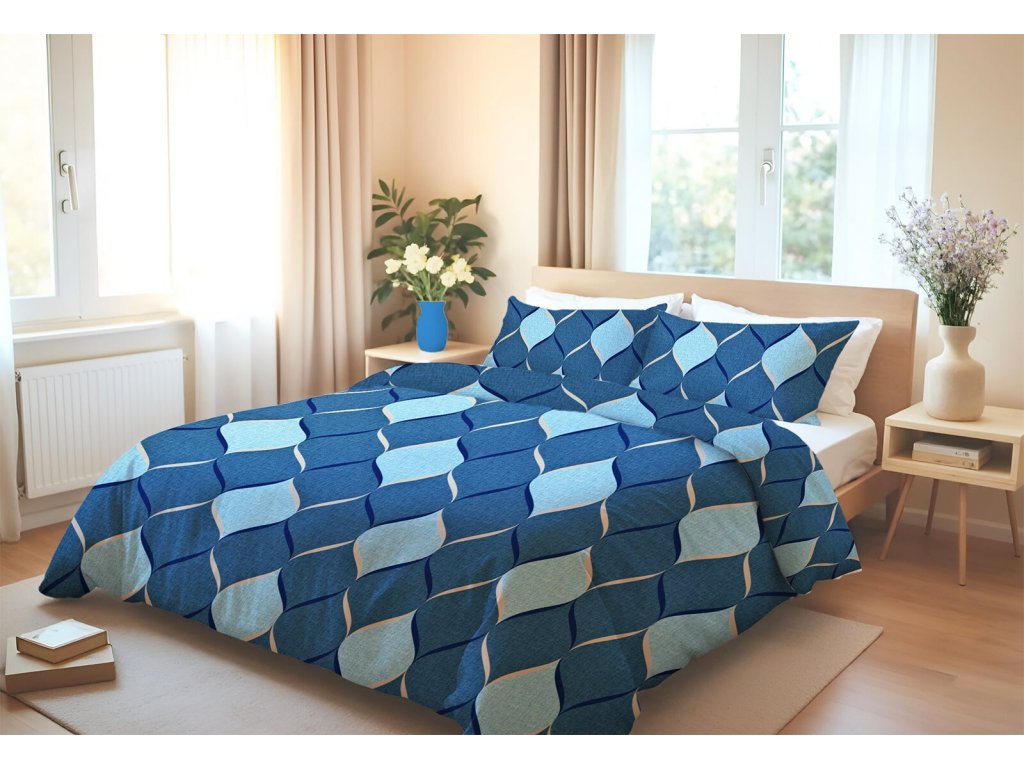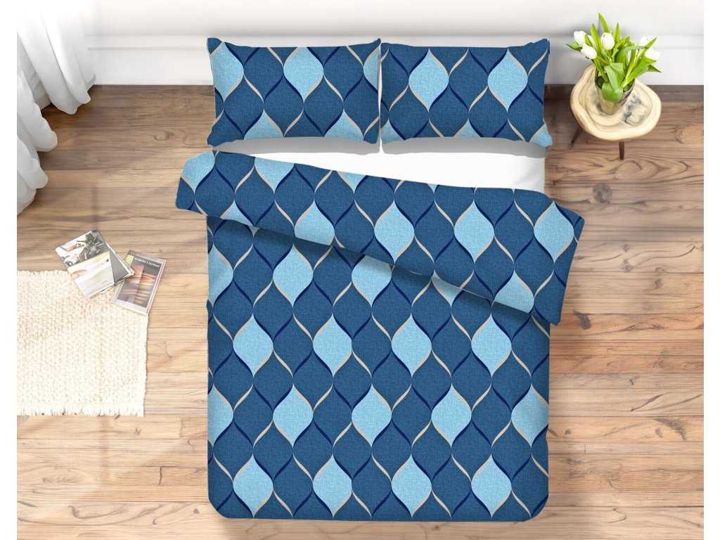 Dodajte svojej spálni štýl a eleganciu s posteľnými obliečkami RITMO. Moderný diamantový vzor na tmavomodrom podklade so svetlomodrými akcentmi pôsobí nadčasovo a vytvorí vo vašej spálni harmonickú a pokojnú atmosféru.