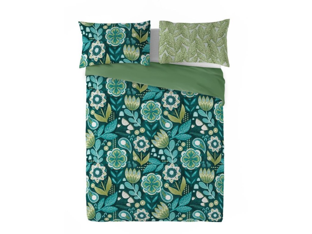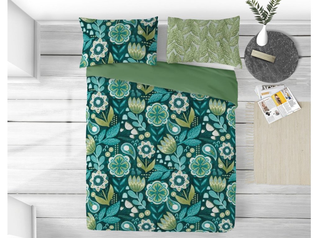 Spodná strana obliečky na paplón je jednofarebná v zelenej farbe, ktorá krásne zvýrazní hlavný vzor. Obliečky na vankúš sú potlačené z oboch strán, takže si môžete ľahko meniť vzhľad podľa nálady.